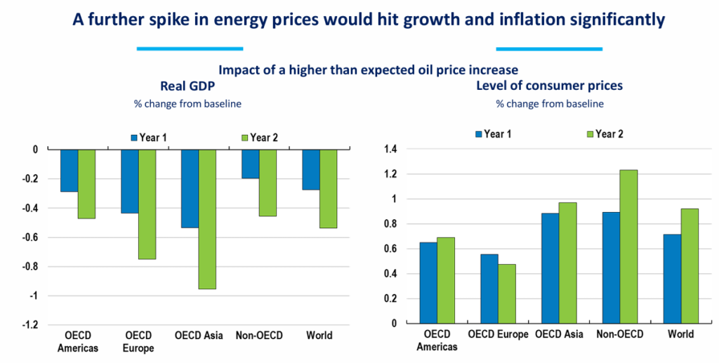 Los efectos para mí son inconmensurables, puesto que como en el caso del COVID las estimaciones iniciales muy bajas hacían prever una inflación transitoria, concepto que se abandonó cuando la inflación fue demasiado persistente. Lo mismo pasa ahora con las agencias internacionales, como la OECD que sacó una estimación de los efectos de la guerra con Irán en la disminución del PIB del 0,3% en el primer año y de 0,5% en el segundo, mientras que el efecto en el incremento de la inflación mundial sería de 0,7% en el primer año y de 0,9% en el segundo año (Gráfico 3).
